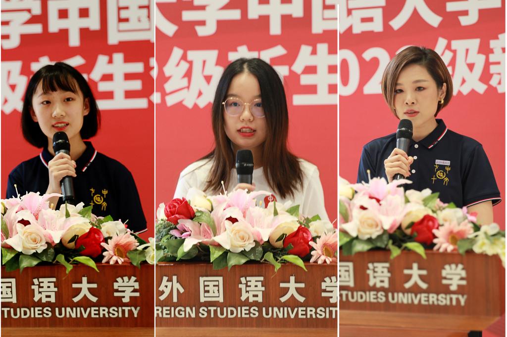 姚琼斐同学和丁俊峰同学分别作为本科生、研究生在校生代表发言。姚琼斐回答了“为什么在外语院校学中文”的问题,介绍了中文系学生的“三宝”——良师、益友和良好的读书习惯,表达了身为中文学子的自豪;丁俊峰希望新生以目标之心、平和之心和开拓之心迎接新的身份,互相学习,共同成长。